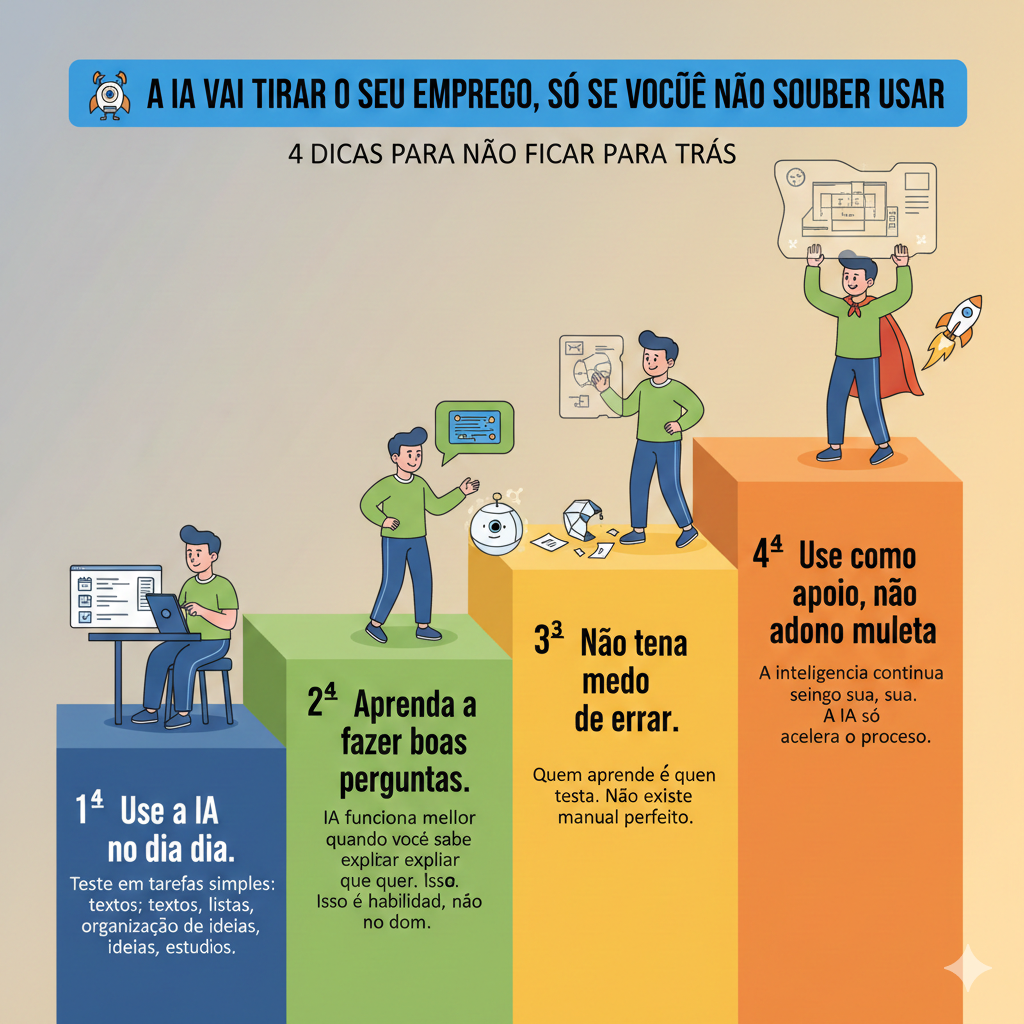 No trabalho, acontece a mesma coisa. Empresas estão usando IA para analisar informações, ganhar tempo e reduzir erros. Quem entende essa lógica passa a valer mais. Quem ignora, começa a perder espaço.