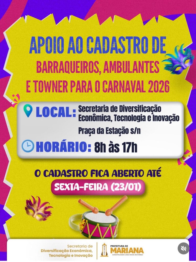 Termina nesta sexta-feira, 23 de janeiro, o prazo para o cadastro de trabalhadores interessados em atuar no comércio de alimentos e bebidas durante o Carnaval 2026 em Mariana. O chamamento público contempla barracas fixas, comércio ambulante e veículos do tipo Towner que irão ocupar espaços públicos da cidade durante o período da festa.