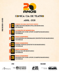 A Cômica Cia de Teatro completa, em abril, 20 anos de atuação em Mariana, com uma trajetória que reúne produção de espetáculos, formação de público e atividades de ensino teatral.