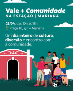 A Vale realiza neste sábado (25/04), em Mariana, o evento “Vale+ Comunidade na Estação”, com programação gratuita na Praça da Estação. A iniciativa reúne oficinas interativas, apresentações musicais, atividades circenses e uma feira de empreendedorismo, além da exposição de projetos sociais apoiados pela empresa.